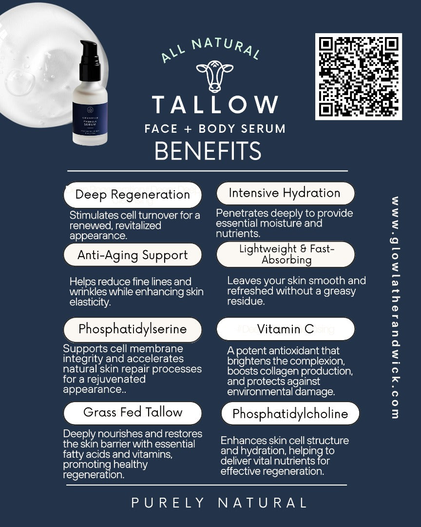 Lightweight • Nourishing • Fast-Absorbing This silky, lightweight serum melts effortlessly into skin, delivering deep moisture without a greasy feel. Made with nutrient-rich tallow and botanical oils to support a healthy, radiant glow—head to toe.